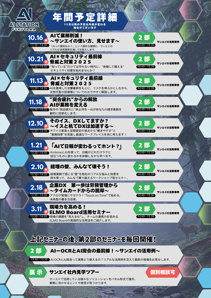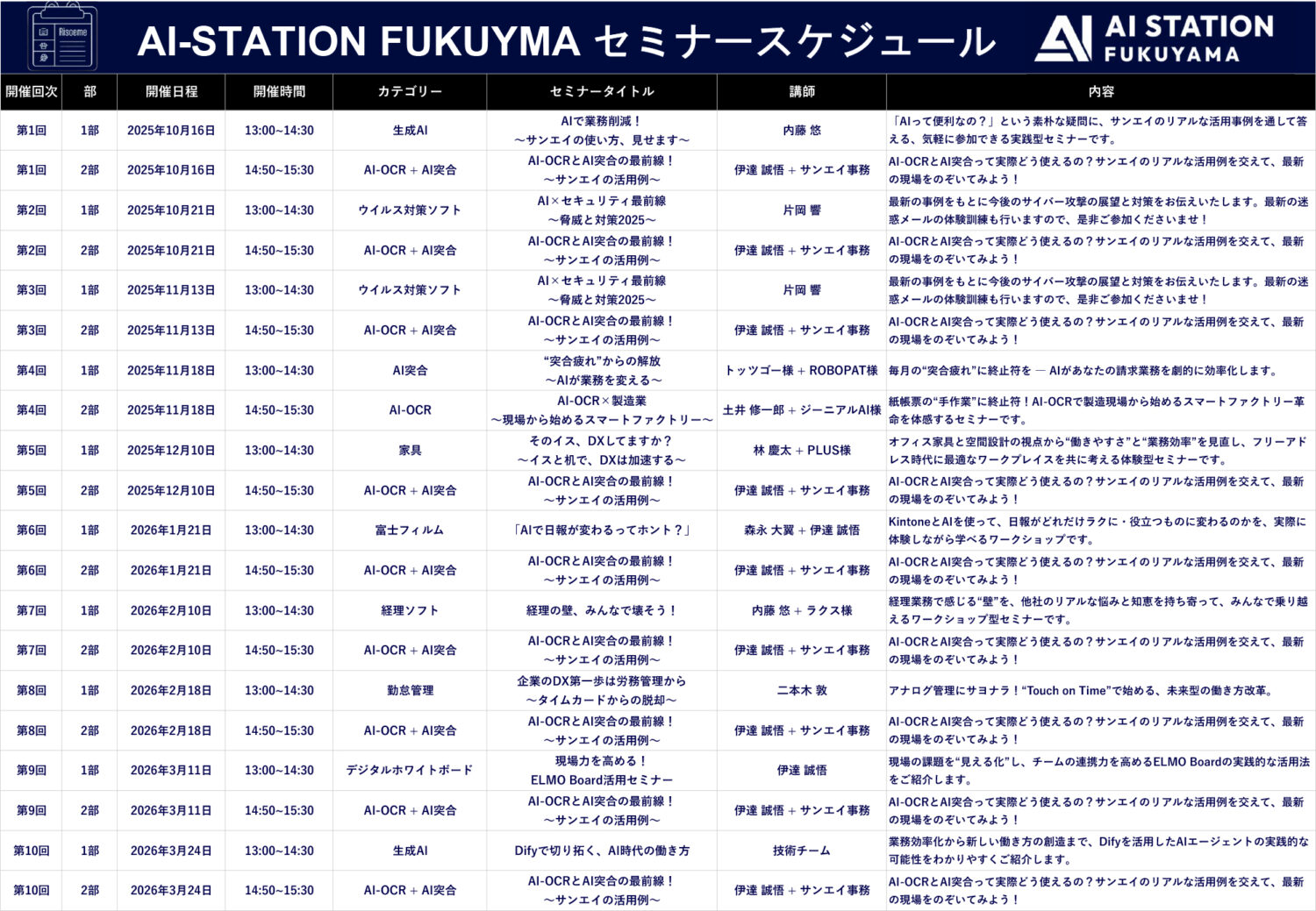 2025.09.25 サンエイ企画 セミナー年間スケジュール 当社で開催予定の年間セミナーを一覧にまとめました。ご興味のあるテーマがございましたら、ぜひご確認ください。 年間予定詳細 PDFで見る サンエイ企画一覧に戻る